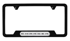 - Description: Your Dodge Charger awaits your personal finishing touches. This Black powder-coated 304 Stainless Steel Charger logo license plate frame provides just the opportunity. This one has two top holes and comes complete with matching finish hardware hider caps.
